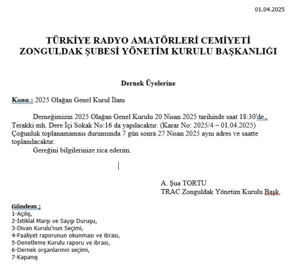 Derneğimizin 2025 Olağan Genel Kurulu 20 Nisan 2025 tarihinde saat 18:30'de Terakki mh. Dere İçi Sokak No:16 da yapılacaktır. (Karar No: 2025/4-01.04.2025) Çoğunluk toplanamaması durumunda 7 gün sonra 27 Nisan 2025 aynı adres ve saatte toplanılacaktır.
